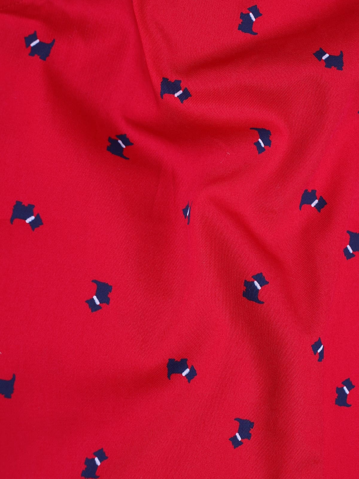 The bright red hue of the shirt adds a lively and energetic vibe, making it a standout choice for various occasions. The blue dog print, scattered across the fabric, adds a touch of whimsy and individuality, showcasing your unique personality and love for eye-catching details.