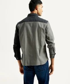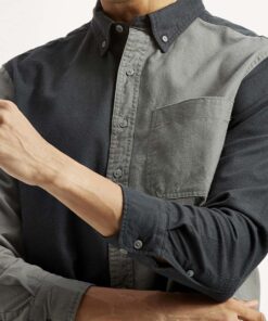 The colorblock design is not only visually appealing but also thoughtfully balanced. The varying shades of grey are arranged in a way that enhances dimension while maintaining harmony, resulting in a cohesive and modern composition. The buttons, selected in coordinating tones, complement the overall design seamlessly and add to the shirt’s polished finish. The chest pocket adds a subtle functional element, enhancing the utilitarian charm while contributing to the overall visual balance. Every element—from the placement of the color panels to the finishing of the edges—reflects meticulous design consideration aimed at achieving both style and practicality.