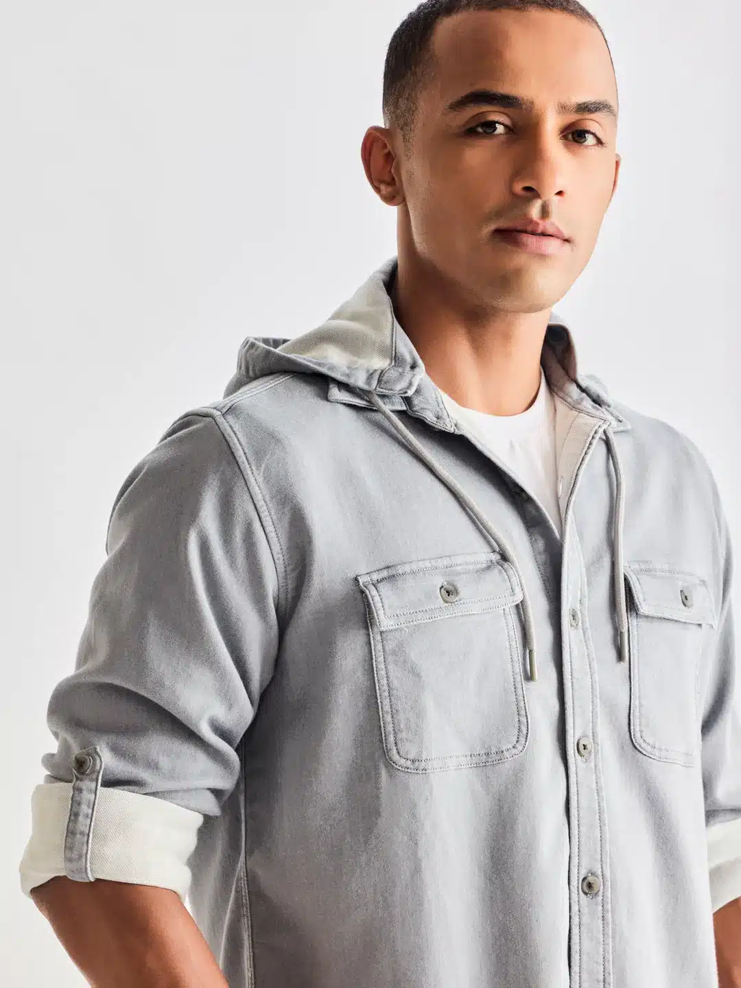 The Grey Hooded Denim Shirt is a stylish and versatile piece that combines the rugged appeal of denim with the modern comfort of a hoodie. Designed for those who appreciate both fashion and functionality, this shirt is crafted from high-quality denim fabric, ensuring durability while maintaining a soft, comfortable feel. The neutral grey hue adds a contemporary and understated elegance, making it a go-to choice for casual wear, layering, and transitional weather.