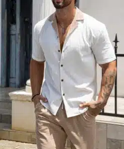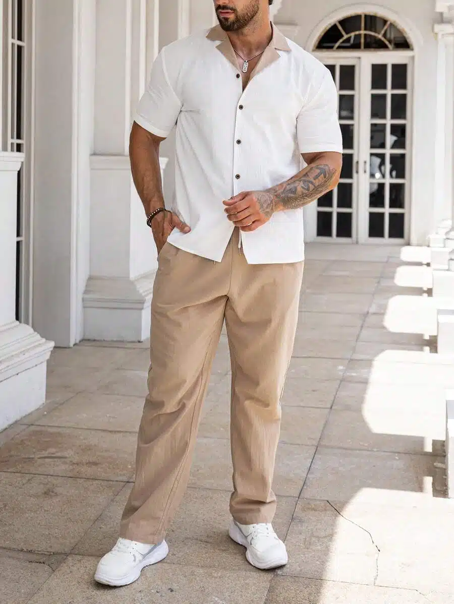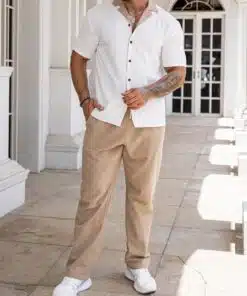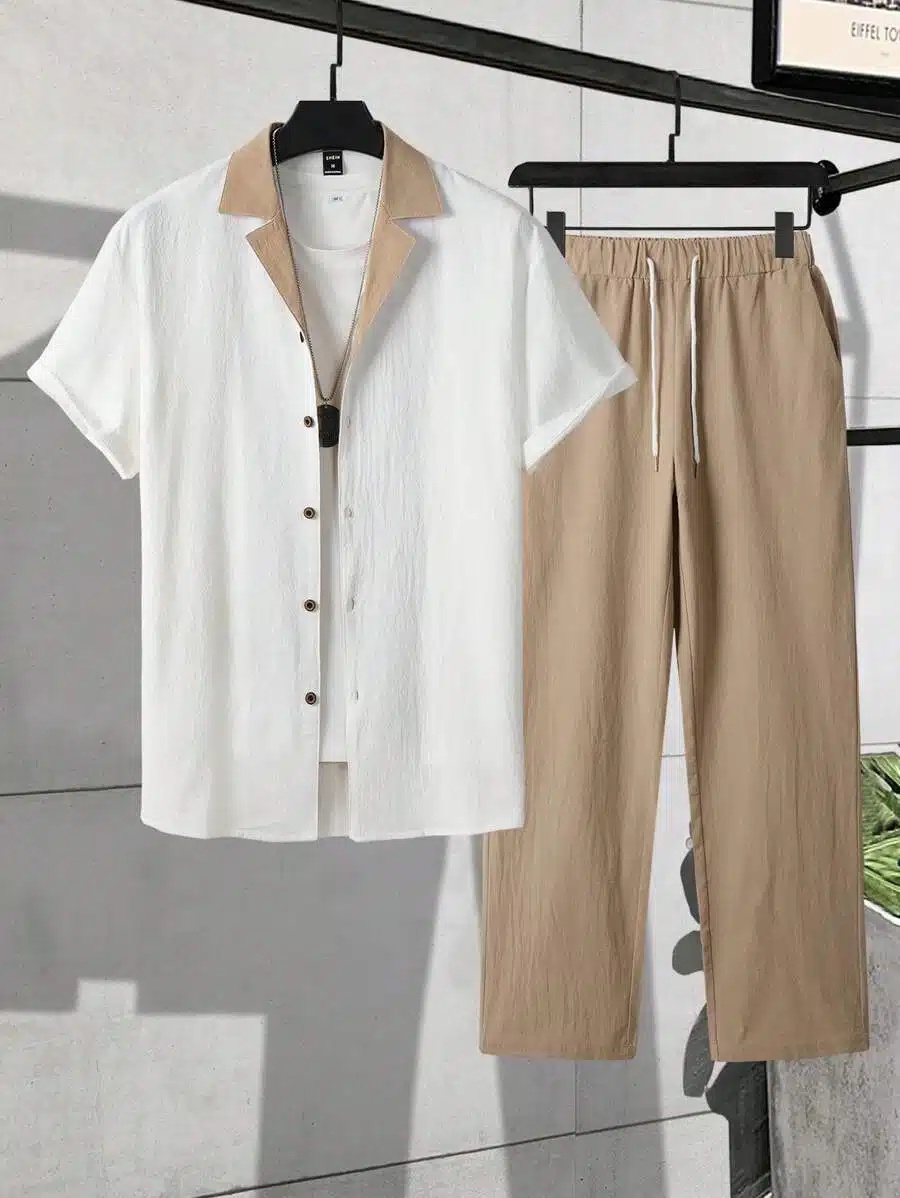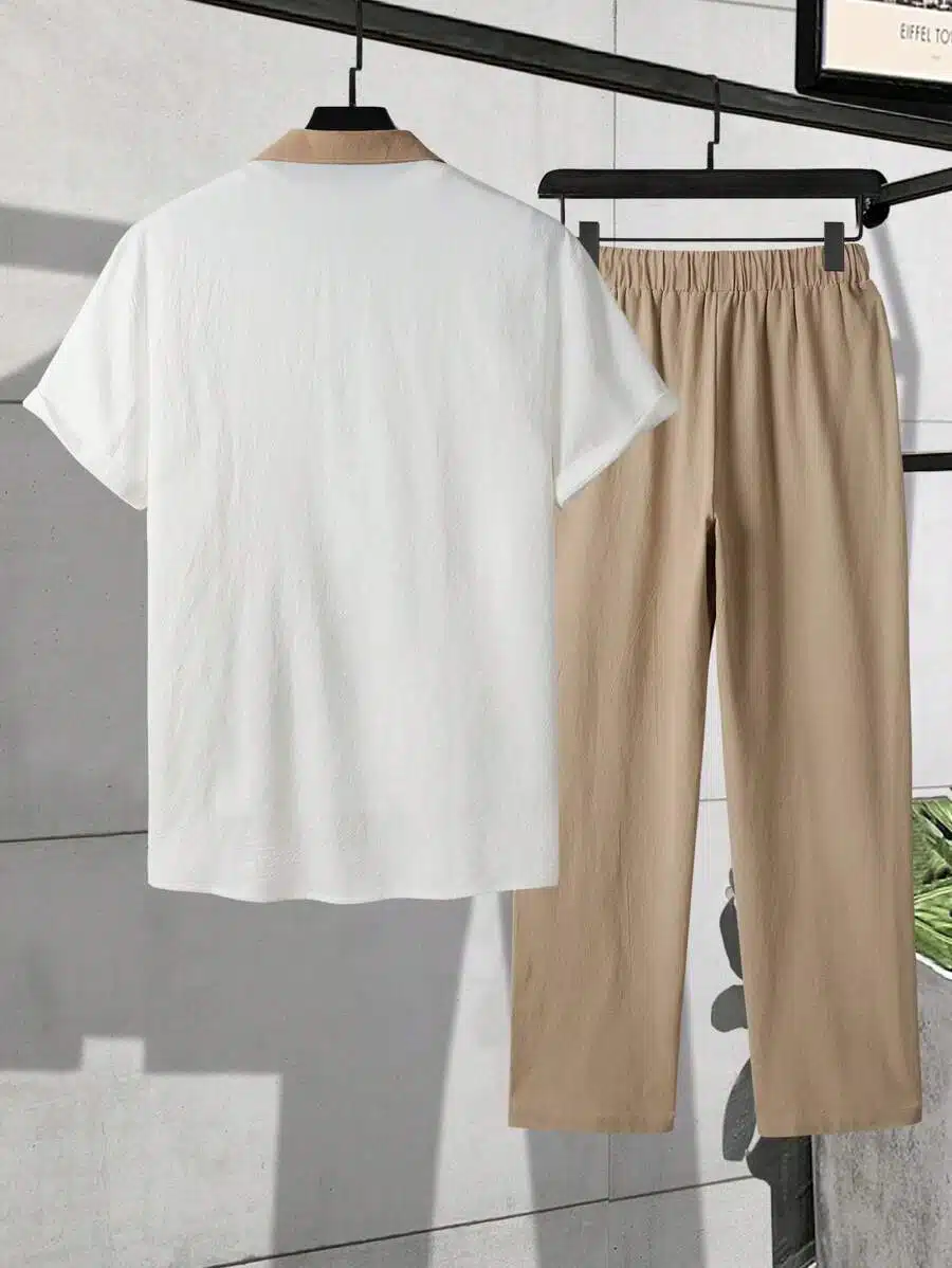 • Set Includes: Matching white shirt and cream pants for a luxurious outfit.