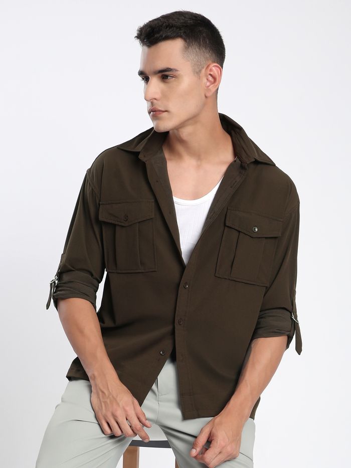 The Men’s Brown Roll-Up Sleeve Casual Shirt is a wardrobe staple for men who appreciate effortless fashion. Pair it with jeans for a rugged, casual look or dress it up with chinos for a refined yet relaxed ensemble. Whether worn solo or layered over a t-shirt, this shirt delivers a stylish edge that’s perfect for any occasion.