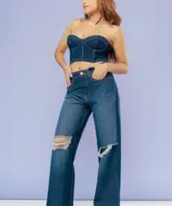 Midnight Blue Distressed Wide Jeans, a perfect blend of edgy fashion and relaxed comfort. Designed for women who love a chic yet effortless look, these jeans feature a high-rise waist that enhances your silhouette while providing all-day comfort. The wide-leg fit flows beautifully from hip to hem, creating a flattering and elongated shape that suits all body types. Whether you’re heading out for a casual day or styling them for a trendy night out, these jeans offer the perfect mix of laid-back charm and contemporary appeal.