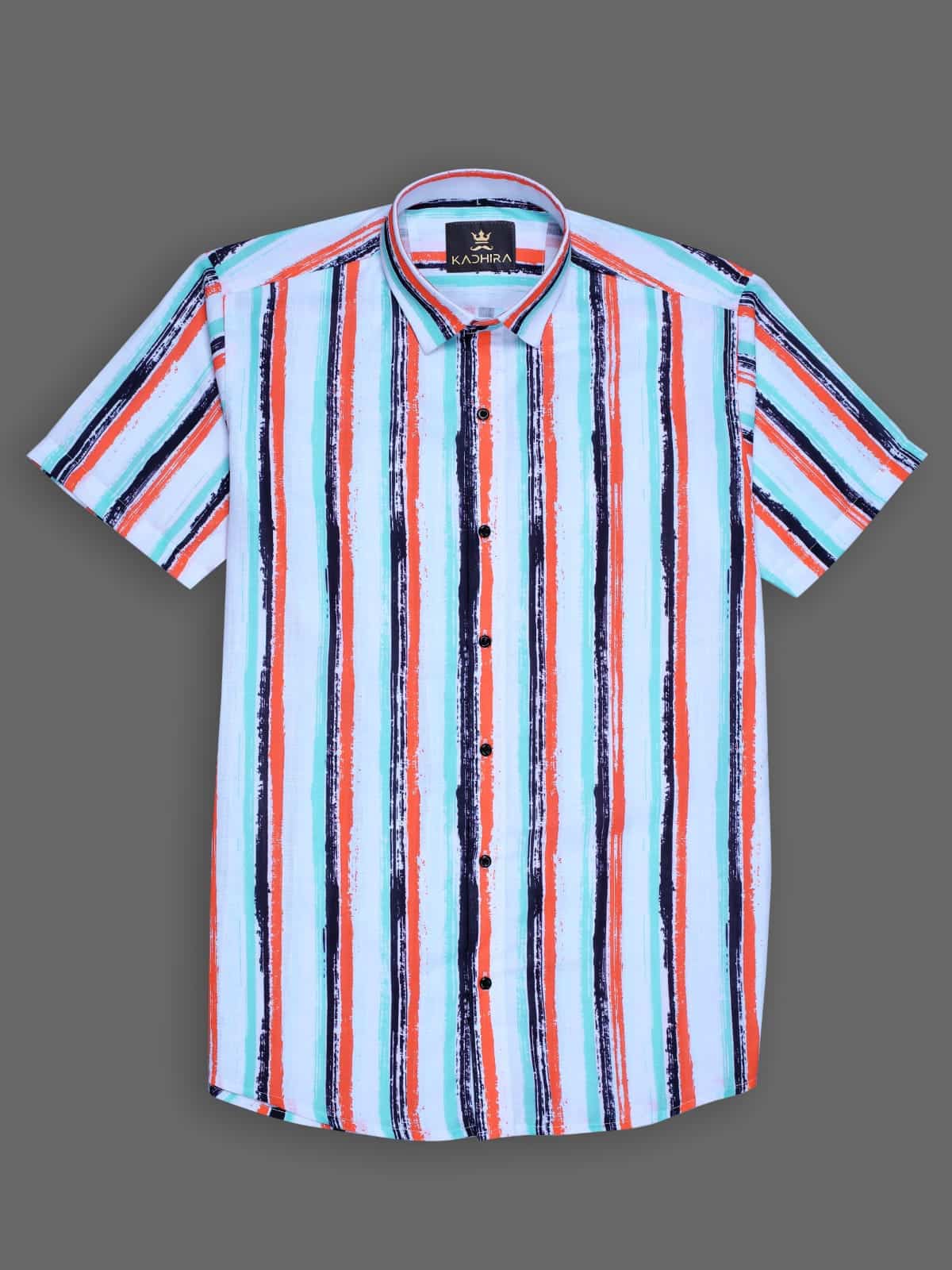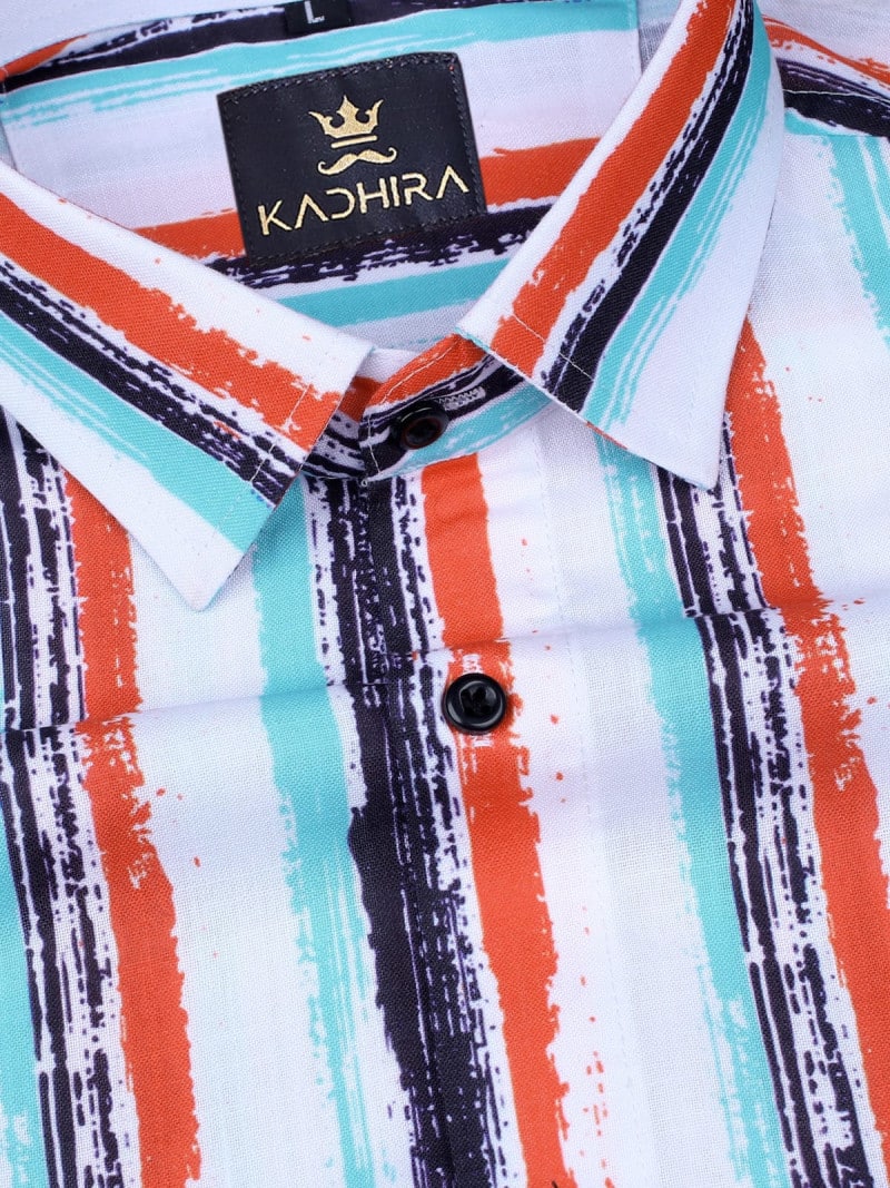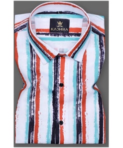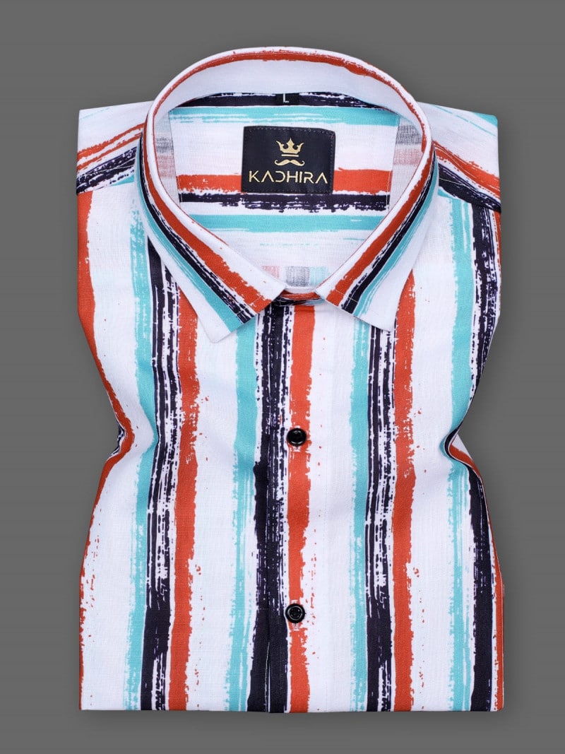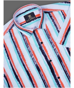 Men’s Digital Printed Shirt, a masterpiece adorned with vibrant multi-color stripes. This shirt is not just an ensemble; it’s a canvas of modern art, designed for the man who dares to be bold.