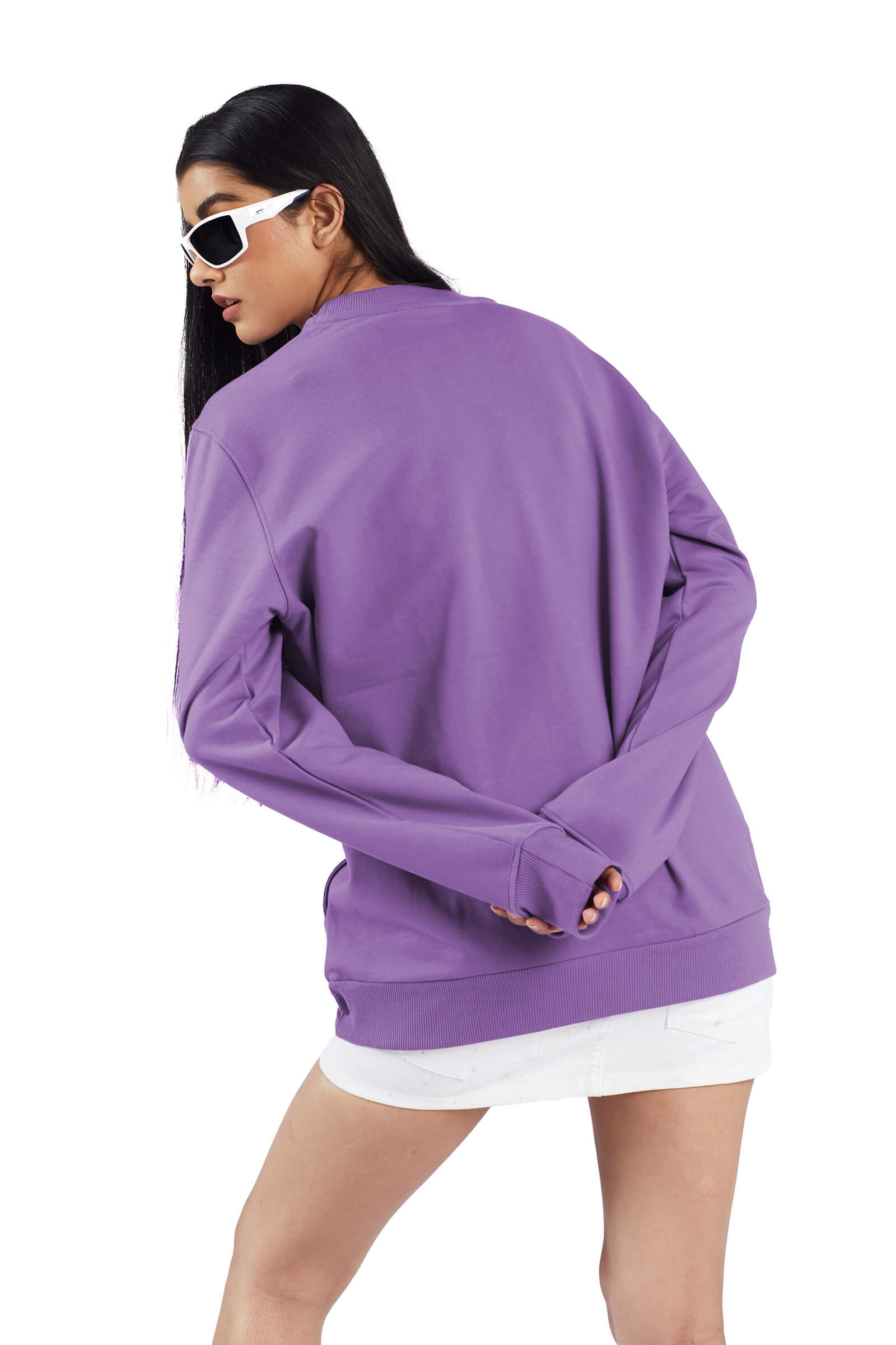 Envision yourself in this jumbo sweatshirt, where the majestic purple color sets the tone for a luxurious and eye-catching aesthetic. The oversized silhouette adds a touch of grandeur, allowing you to make a bold statement with both size and the regal color palette.