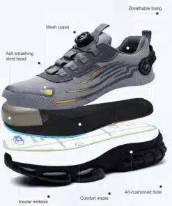 The breathable mesh upper enhances airflow, keeping your feet cool and dry even during long shifts. Meanwhile, the shock-absorbing cushioned insole offers excellent arch support and impact resistance, reducing strain on your feet and joints. The non-slip rubber outsole ensures maximum traction on various surfaces, preventing slips and falls in wet or uneven conditions. Whether you’re working on a construction site, in a factory, or in a high-risk environment, the Rotating Button Anti-Smash and Anti-Puncture Safety Shoes provide the perfect combination of safety, durability, and modern convenience.