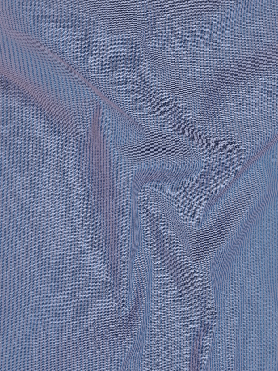 The sapphire blue hue, reminiscent of deep ocean depths, sets a tone of confidence and sophistication. The precisely tailored stripes, thoughtfully designed for a balanced aesthetic, create a shirt that seamlessly transitions from formal occasions to more relaxed settings.