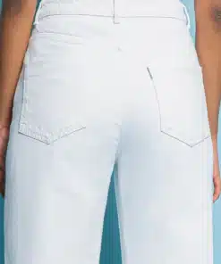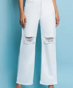 White Wide Leg with Distress Jeans. These jeans are the perfect combination of relaxed fit and edgy details, designed for women who love to make a statement with their denim. Featuring a high-rise waist, these jeans offer a flattering and comfortable fit that cinches at the waist while providing plenty of room through the hips and thighs. The wide-leg silhouette gives them a breezy, carefree look, making them ideal for effortless, all-day wear. Whether you’re looking for a laid-back, weekend-ready outfit or a trendy statement piece, these jeans deliver style and comfort in one.