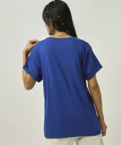 The crew neckline and short sleeves are designed with simplicity in mind, allowing the graphic to be the focal point of the shirt. The boyfriend fit offers a relaxed, comfortable feel that can be styled in various ways. You can wear it untucked for a relaxed, carefree vibe, or tuck it into high-waisted jeans or skirts for a more polished, styled look. The blue color is versatile and easy to pair with any bottom, making this t-shirt a wardrobe essential for those who love a fun, casual style.
